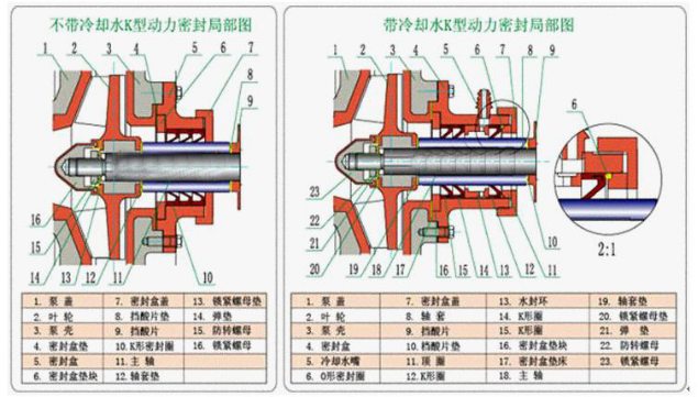 K型動力密封主要由副葉輪(或副葉片)與停車密封(橡膠油封)組成。工作時由于副葉輪(或副葉片)旋轉(zhuǎn)產(chǎn)生的離心力使密封腔處于負壓狀態(tài),從而阻止液體向外泄漏,此時,停車密封不起作用。橡膠油封的唇口因負壓而松開,與軸套產(chǎn)生一定間隙,減小其之間的磨損,延長了使用壽命;停機時,由于副葉輪(或副葉片)停止旋轉(zhuǎn),密封腔由負壓轉(zhuǎn)為正壓,停車密封開始工作,橡膠油封的唇口在壓力作用下緊緊包住軸套,從而達到密封目的。若允許冷卻水滲入介質(zhì)內(nèi),可選用帶冷卻水K型動力密封,即可添加外冷卻水裝置,延長油封的使用壽命。該密封的油封采用氟橡膠制成,主要適用于輸送含固體顆粒的料漿、含雜質(zhì)的污水等腐蝕性介質(zhì)(帶冷卻水K型動力密封用的冷卻水為潔凈的自來水,壓力適宜在0.05Mpa以內(nèi))。