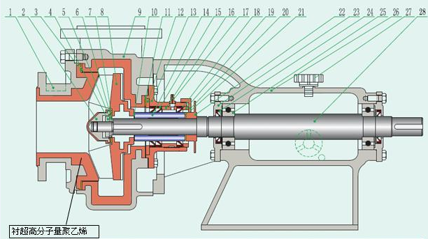 本系列泵為單級單吸懸臂式離心泵,過流部分采用鋼襯超高分子量聚乙烯(UHMW-PE)制成,該材質(zhì)是目前國際上新一代的泵用耐腐耐磨工程塑料;具有優(yōu)異的耐磨性、耐沖擊性(尤其是耐低溫沖擊). 抗蠕變性(耐環(huán)境應力開裂)和極好的耐腐蝕性。